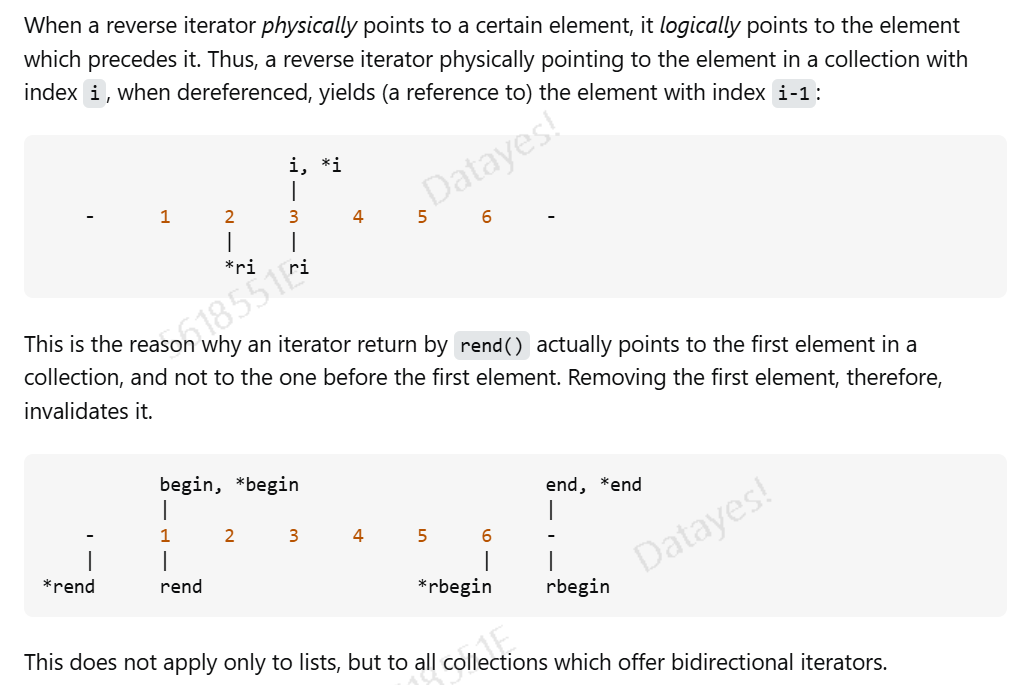 反向迭代器有一个坑点。正向迭代器,指向的位置和解引用对应的元素是一致的;反向迭代器指向的位置和解引用对应的元素差了一个。从前往后看(正向角度),反向迭代器指向位置i,那么解引用会得到i-1位置上的元素。