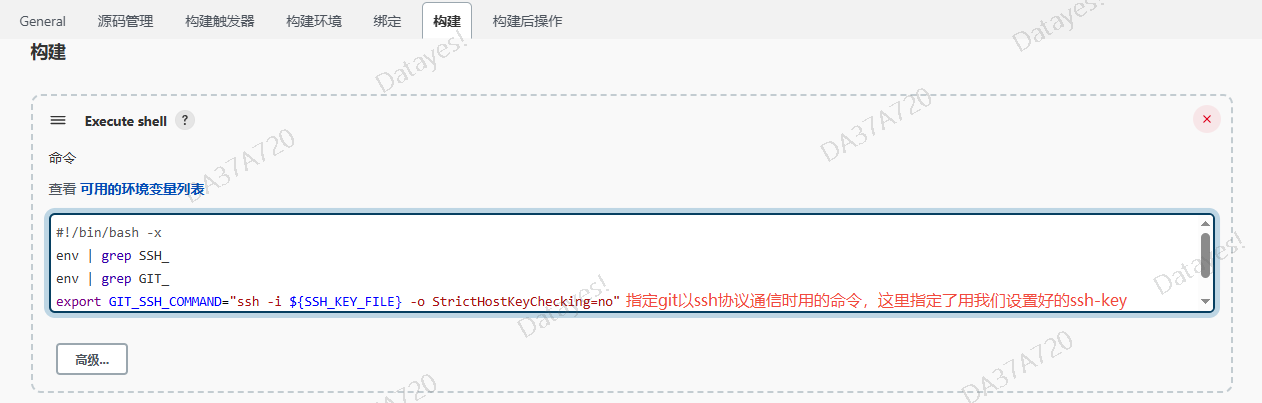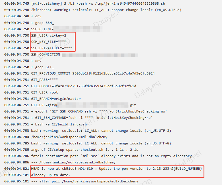 然后,替换掉git ssh协议使用的命令,指定用我们临时生成的ssh-key文件。这样,在后续用户脚本中的git命令连接远程仓库时,都会用上这个key,也就能够成功拉取数据。