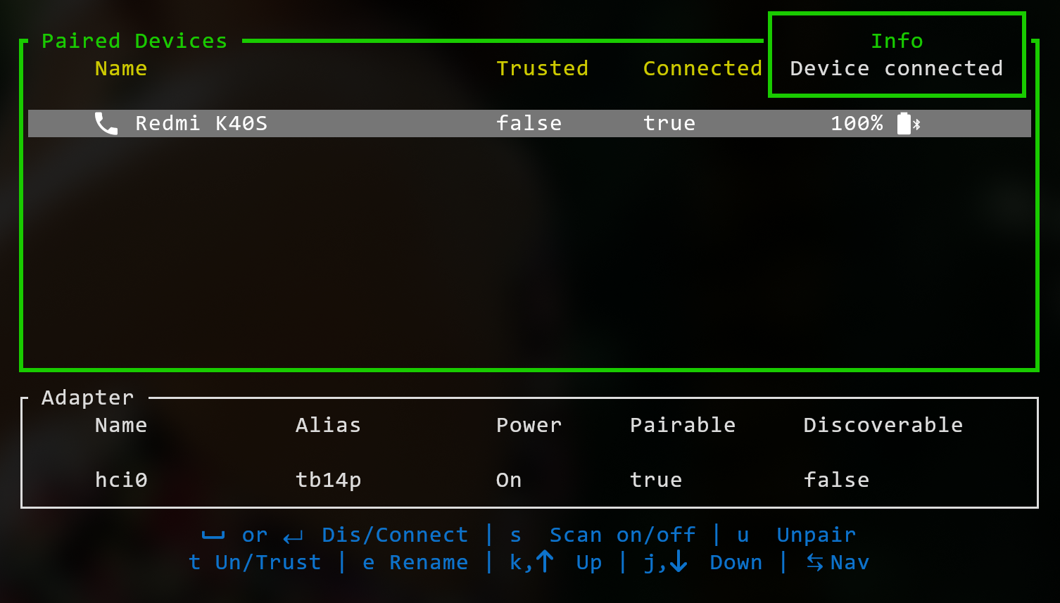 $ pacman -Ss bluezextra/bluez 5.85-1 [已安装] Daemons for the bluetooth protocol stackextra/bluez-libs 5.85-1 [已安装: 5.84-2] Deprecated libraries for the bluetooth protocol stackextra/bluez-qt 6.21.0-1 (kf6) [已安装] Qt wrapper for Bluez 5 DBus APIextra/bluez-tools 0.2.0-6 [已安装] A set of tools to manage Bluetooth devices for Linuxextra/bluez-utils 5.85-1 [已安装] Development and debugging utilities for the bluetooth protocol stack$ systemctl enable --now bluetooth # 启动蓝牙服务$ bluetui # 连接蓝牙的tui界面