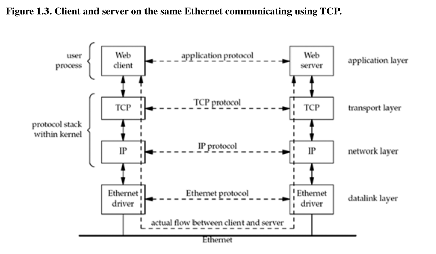 1. the actual flow of information between the client and server goes down the protocol stack on one side, across the network, and up the protocol stack on the other side;