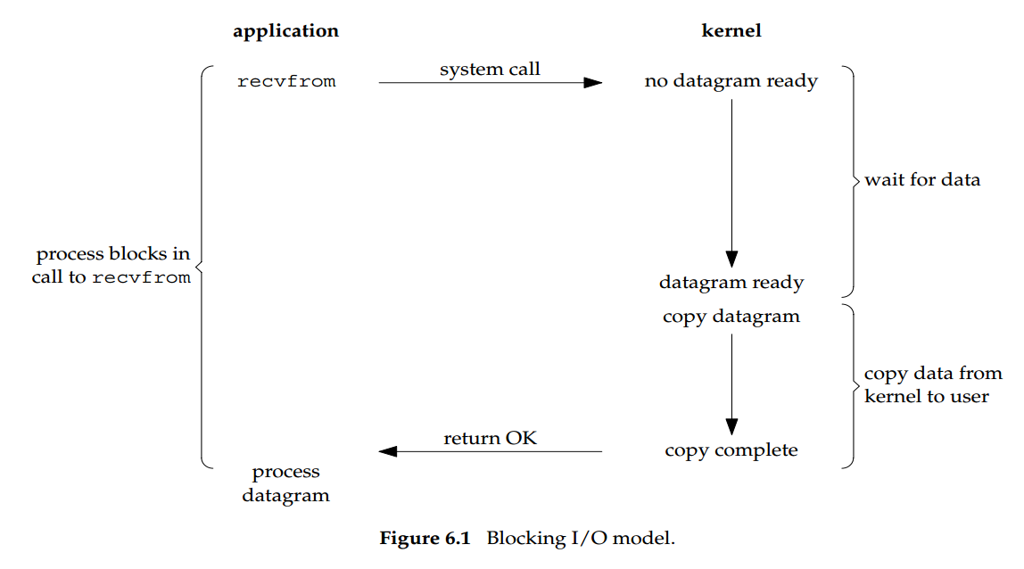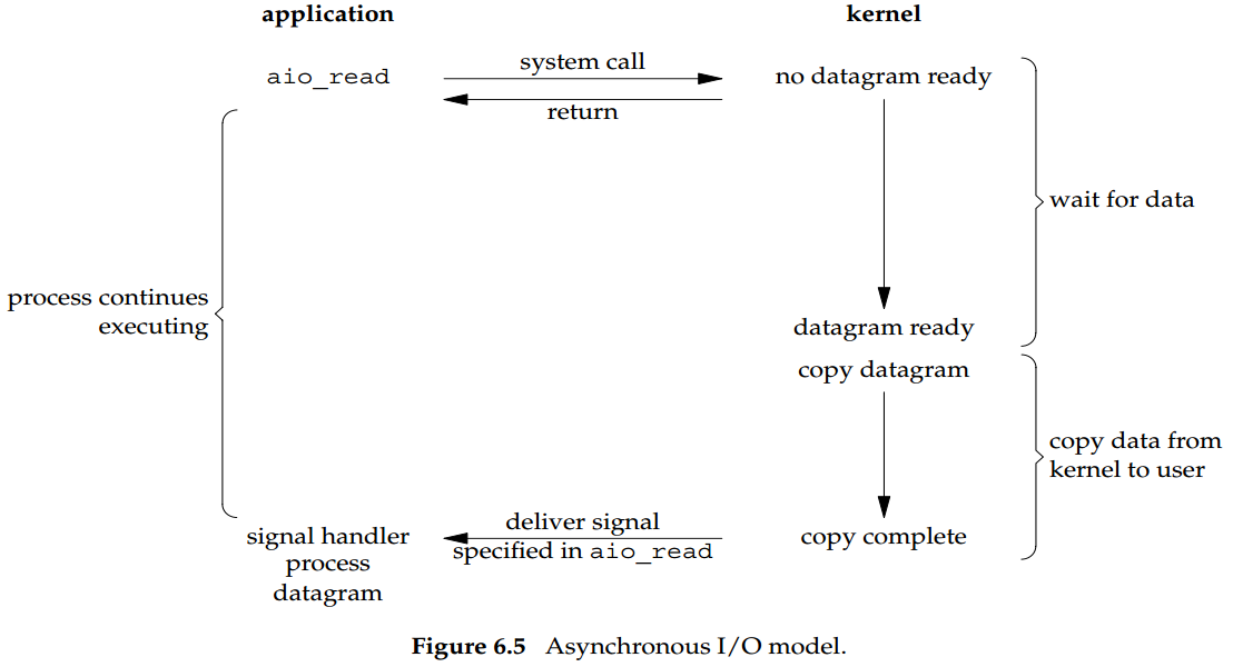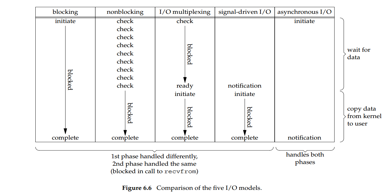 Using these definitions, the first four I/O models—blocking, nonblocking, I/O multiplexing, and signal-driven I/O—are all synchronous because the actual I/O operation (recvfrom