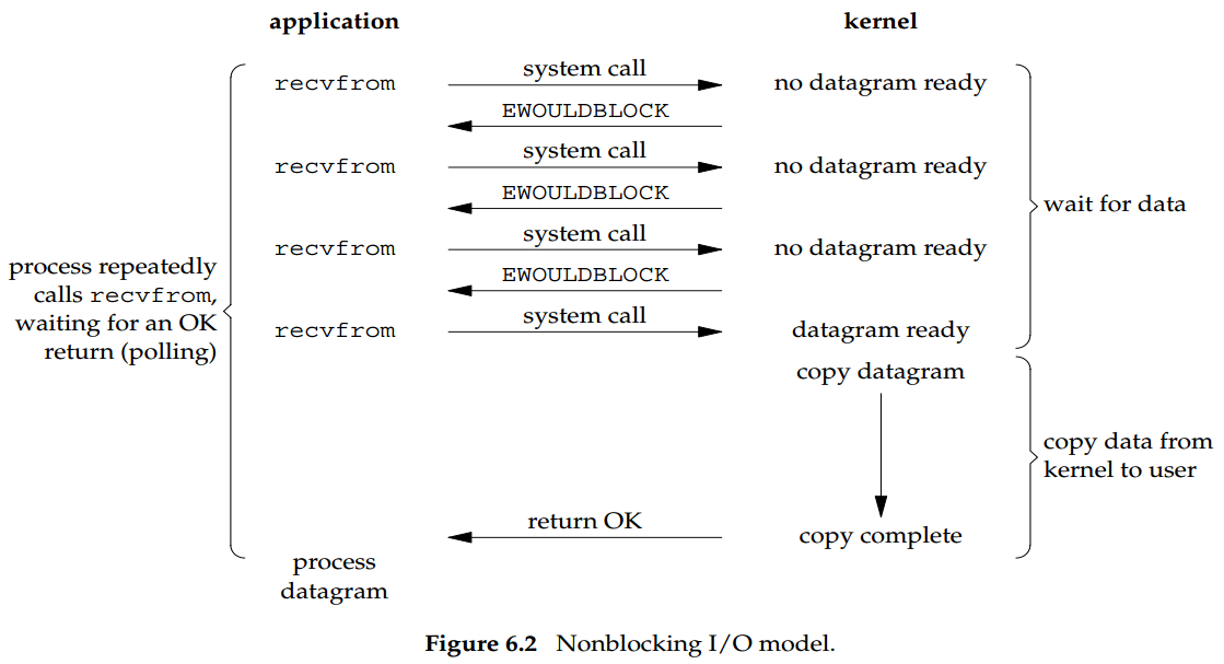 on a nonblocking descriptor like this, it is called polling. The application is continually polling the kernel to see if some operation is ready. This is often a waste of CPU time, but this model is occasionally encountered, normally on systems dedicated to one function.