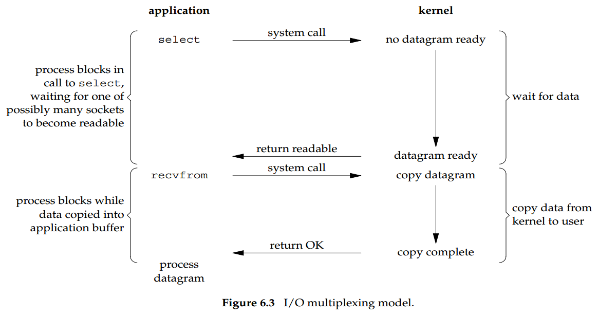, waiting for the datagram socket to be readable. When select returns that the socket is readable, we then call recvfrom